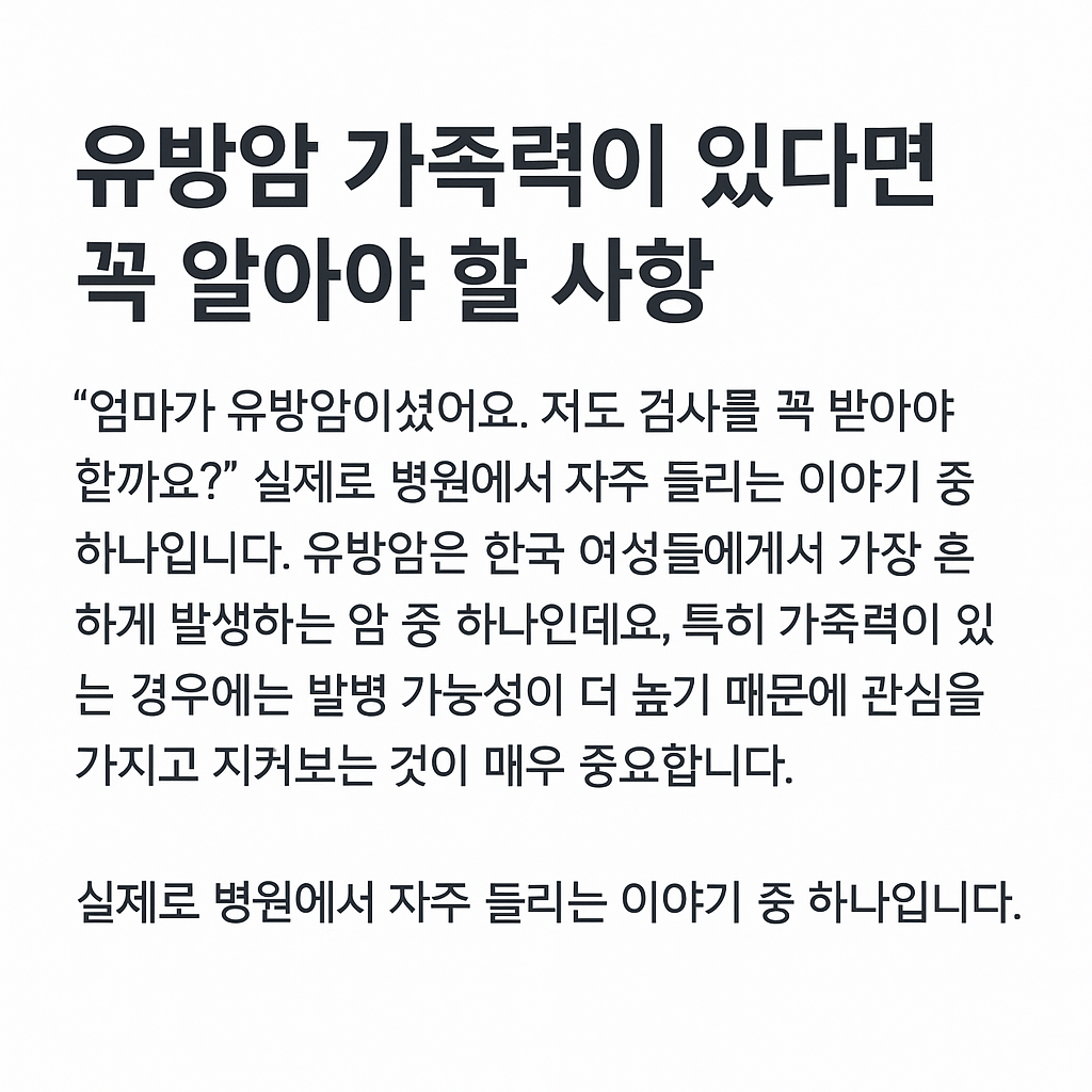 실제로 병원에서 자주 들리는 이야기 중 하나입니다. 유방암은 한국 여성들에게서 가장 흔하게 발생하는 암 중 하나인데요, 특히 가족력이 있는 경우에는 발병 가능성이 더 높기 때문에 관심을 가지고 지켜보는 것이 매우 중요합니다.
